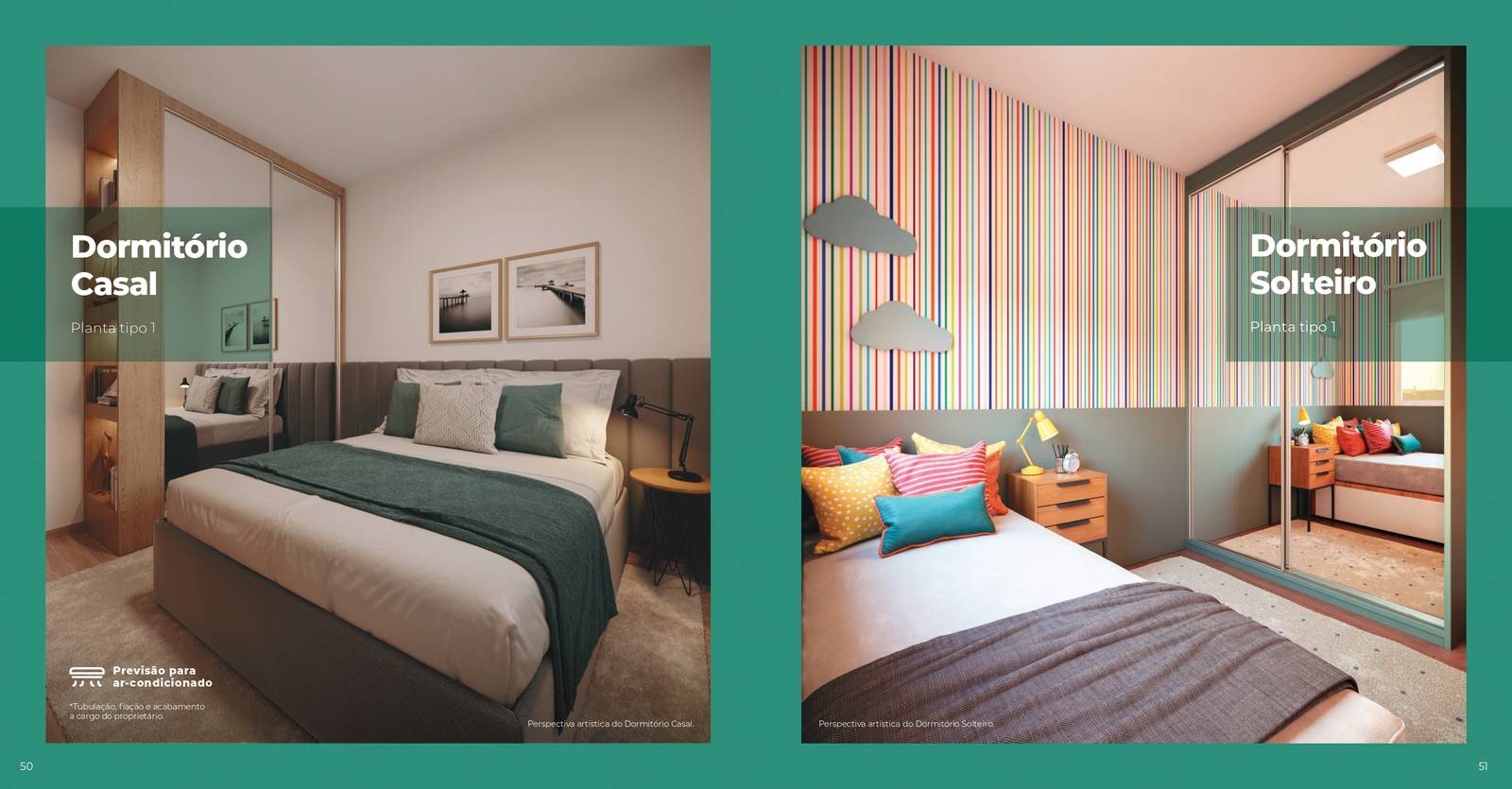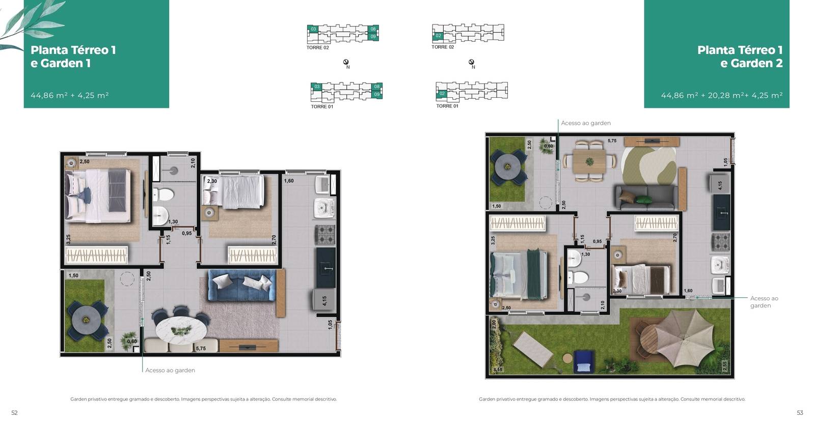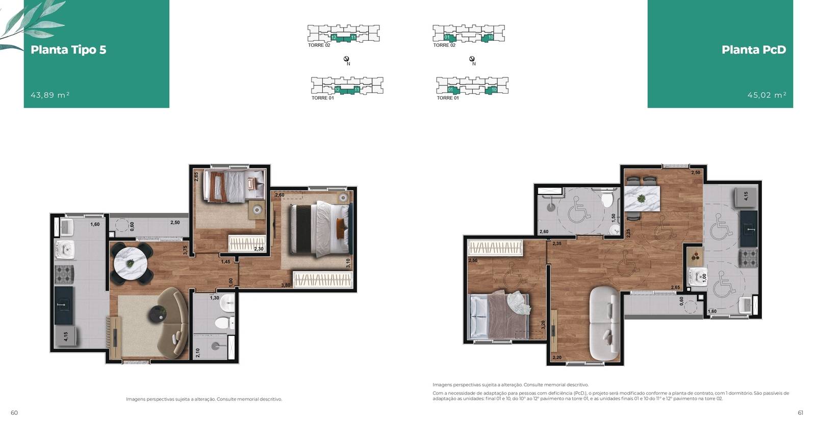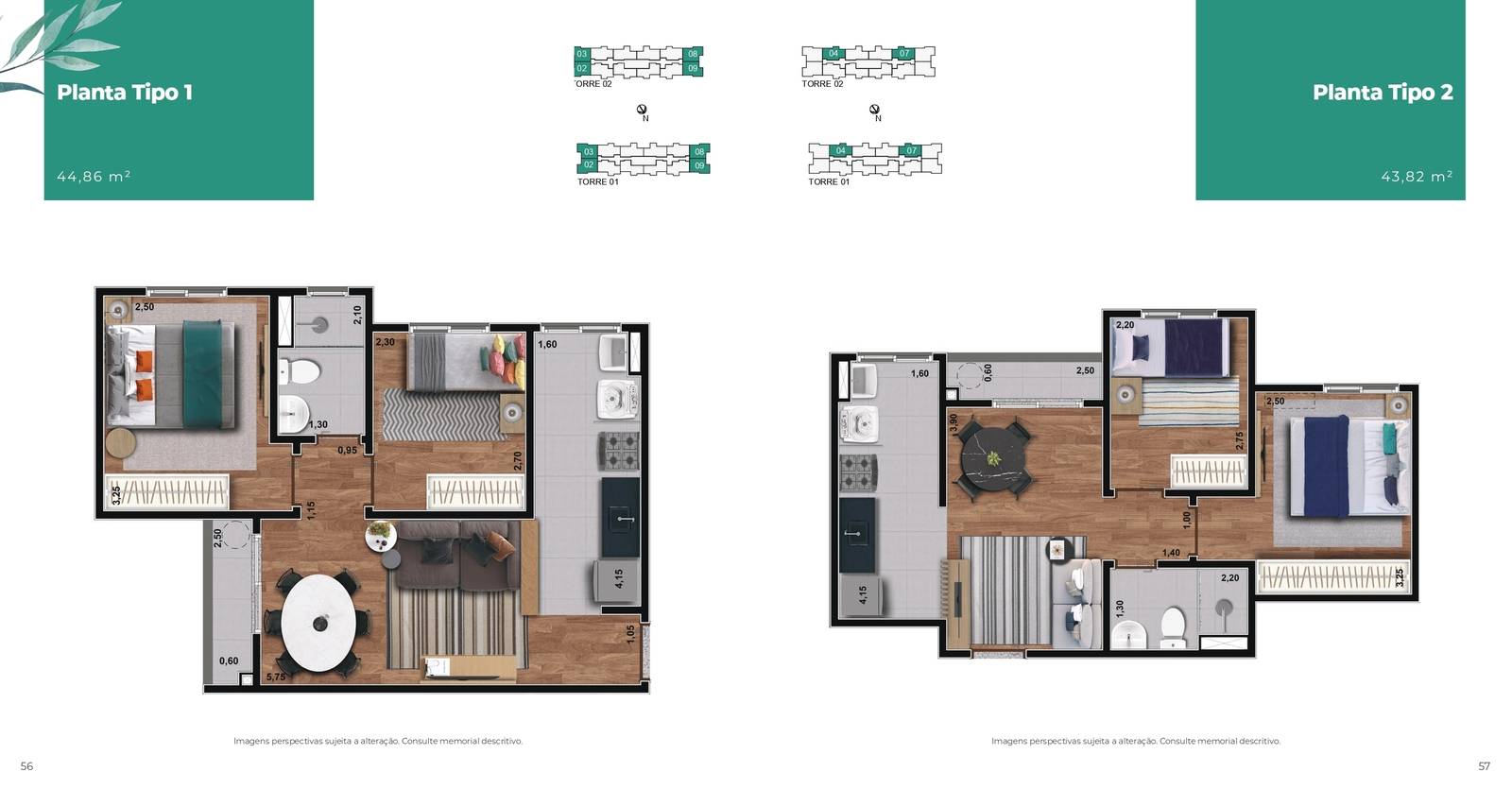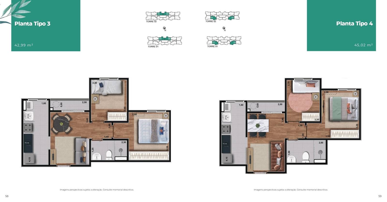 Plantas tipo de 42,99m² até 45,02m²