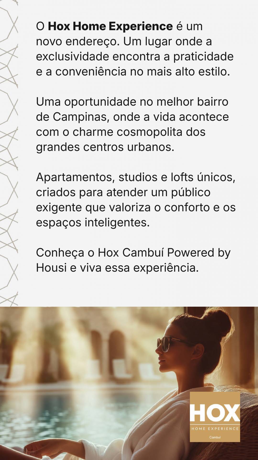 HOX Cambuí Campinas: empreendimento moderno com studios, apartamentos e lofts de 31 a 83 m², com plantas inteligentes e opção de entrega 100% decorada e equipada. Condomínio com lazer completo, piscina, skybar, coworking, academia e serviços integrados Housi. Ideal para morar com praticidade ou investir em locação flexível, com alto potencial de ocupação e liquidez no Cambuí.